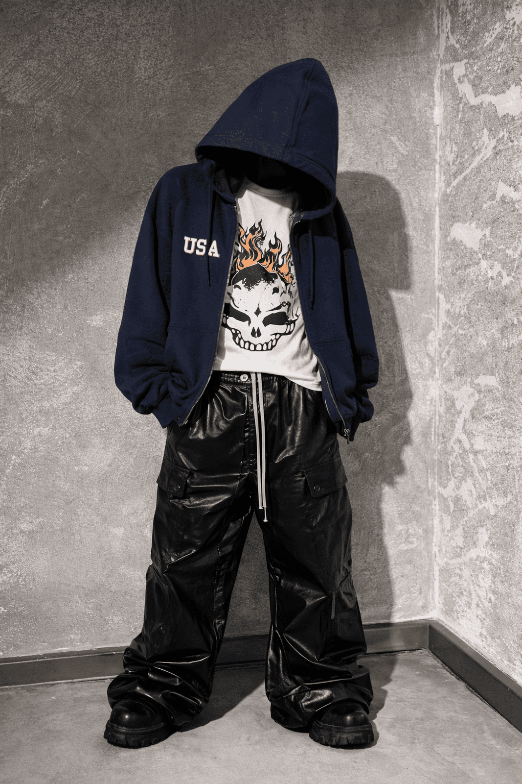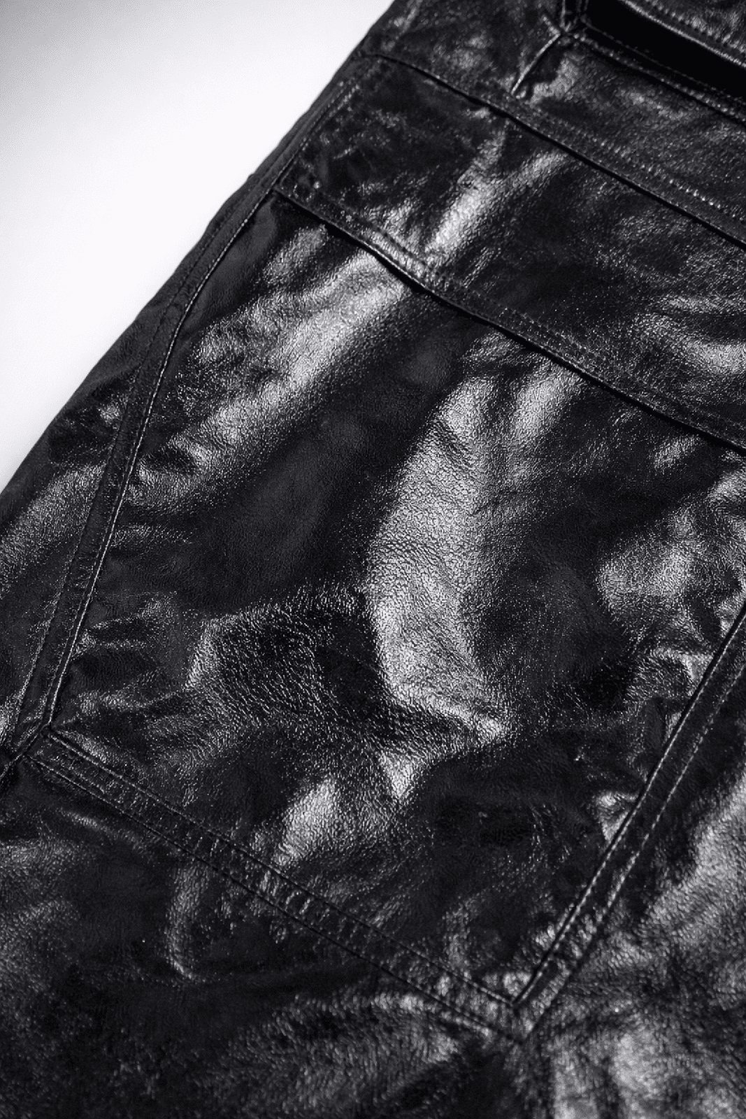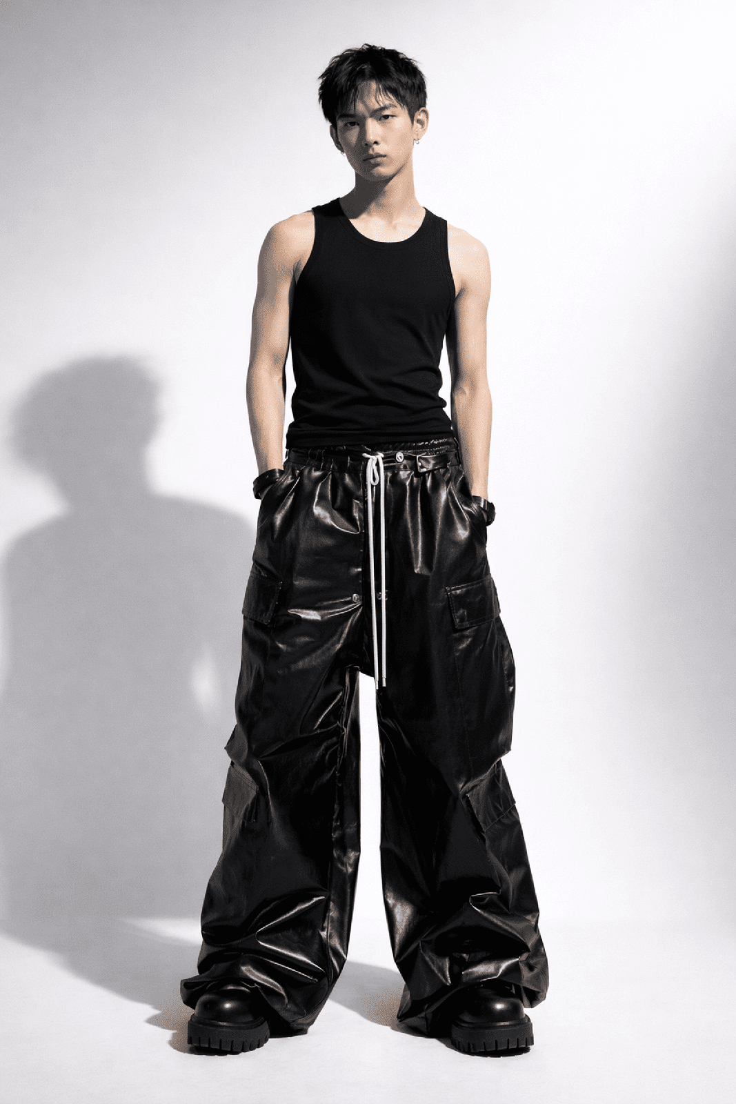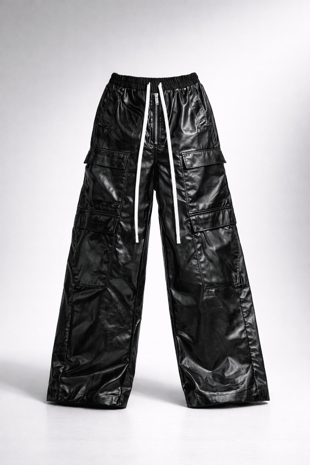 Built for statement fits. These black wide-leg pants feature a glossy PU finish with a structured cargo silhouette and oversized flow. Designed for movement, layering, and late-night street energy.