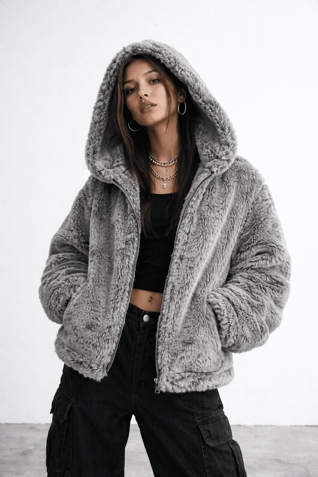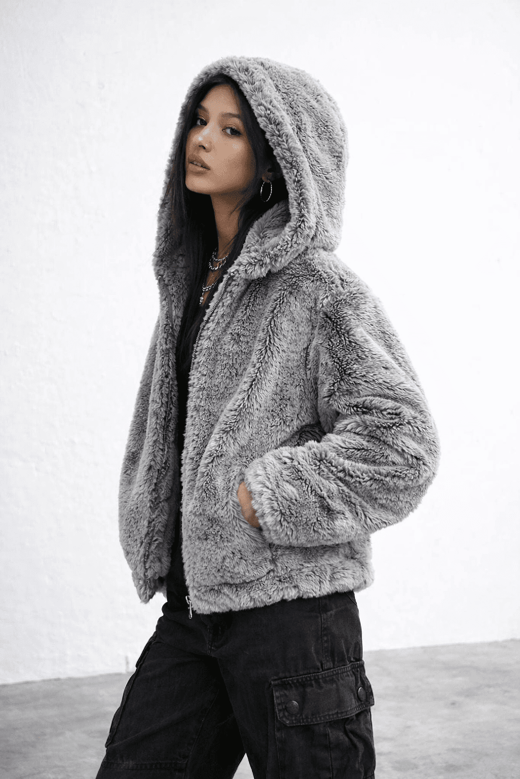 Designed with a soft faux fur finish and a relaxed oversized silhouette, it delivers warmth and comfort without feeling stiff or bulky. The hooded design adds coverage for cold days, while the full zip front keeps the look clean and easy to style.