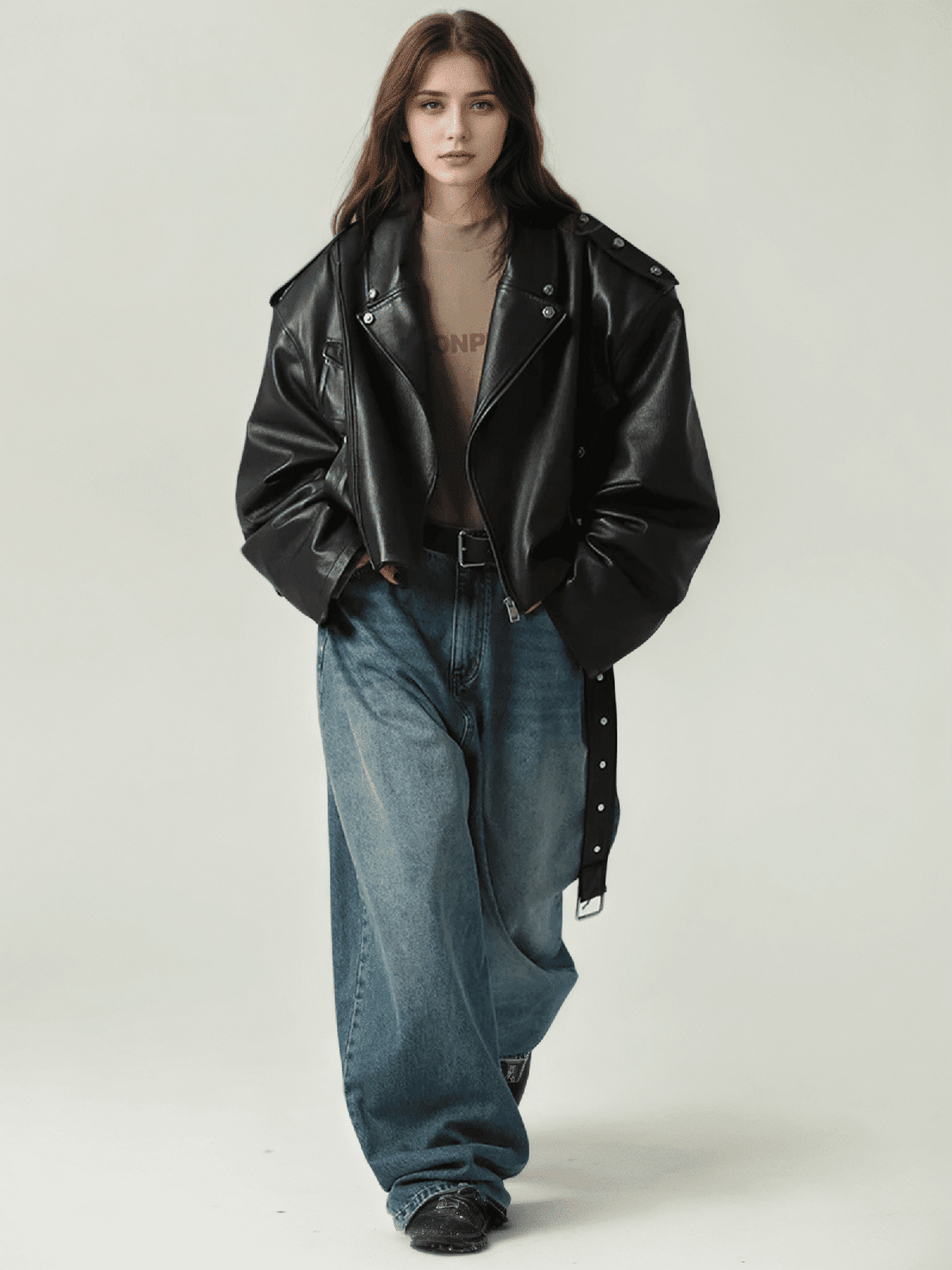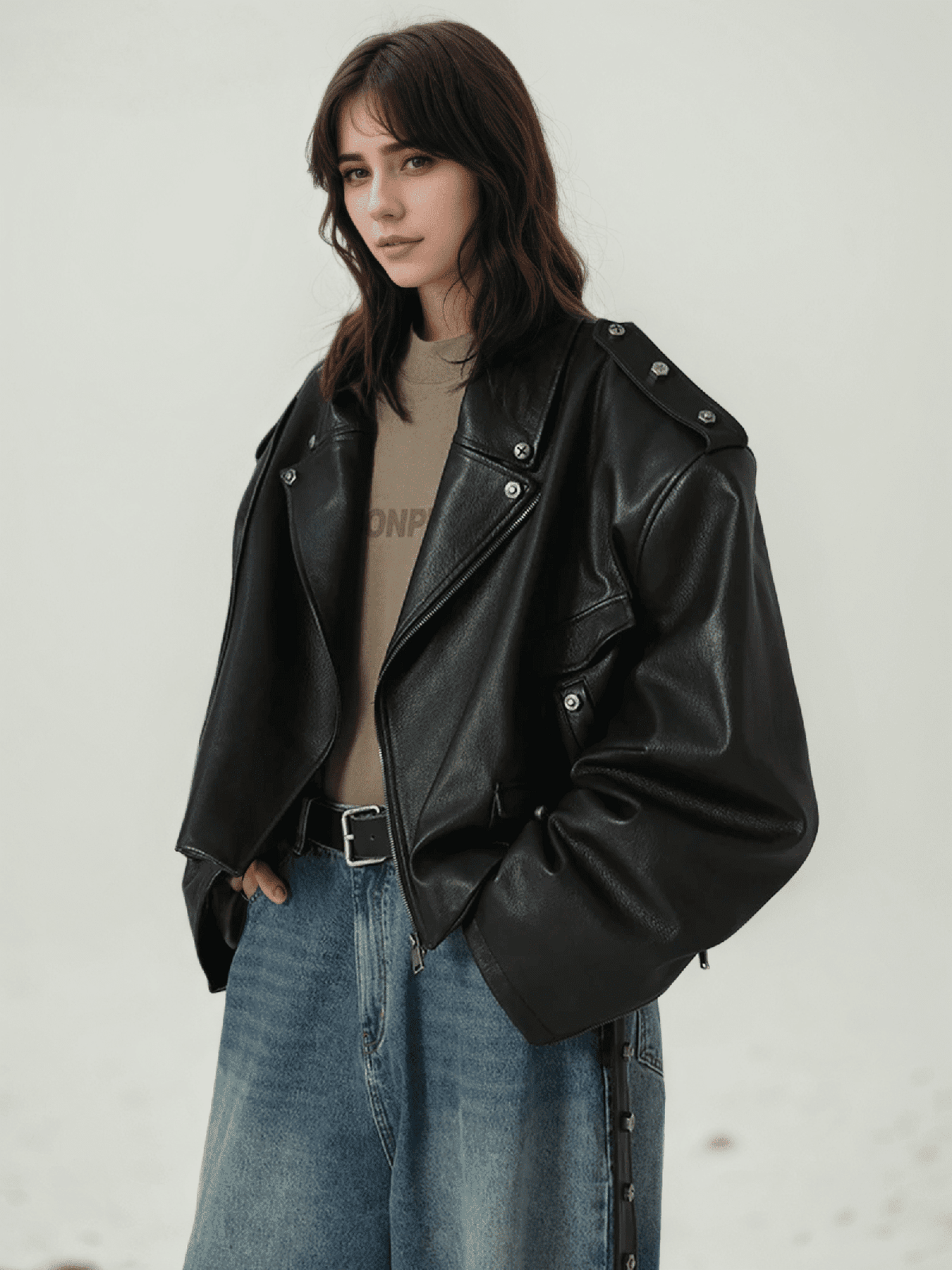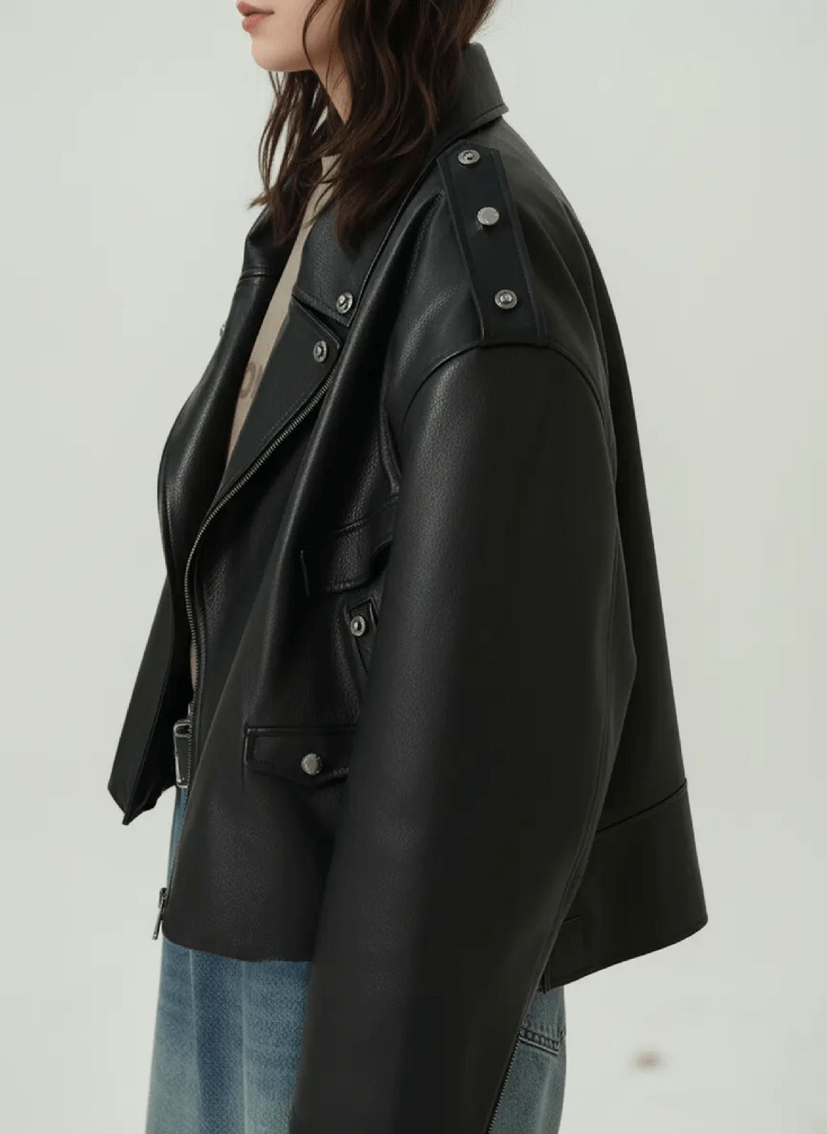 A cropped, oversized biker jacket crafted from smooth PU leather. Heavy look, clean structure, metal rivet details, and a relaxed street fit made for layering in spring and fall.