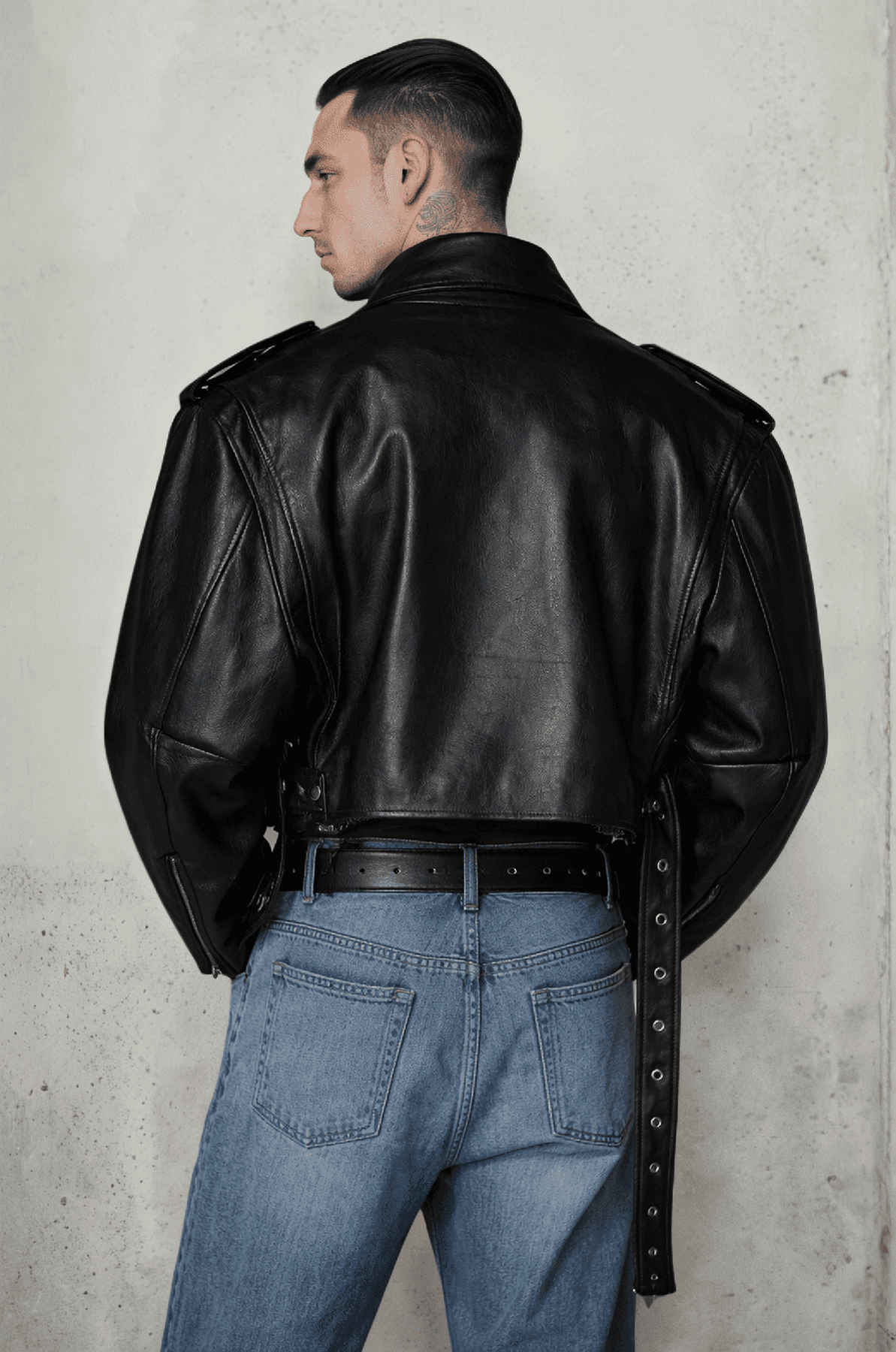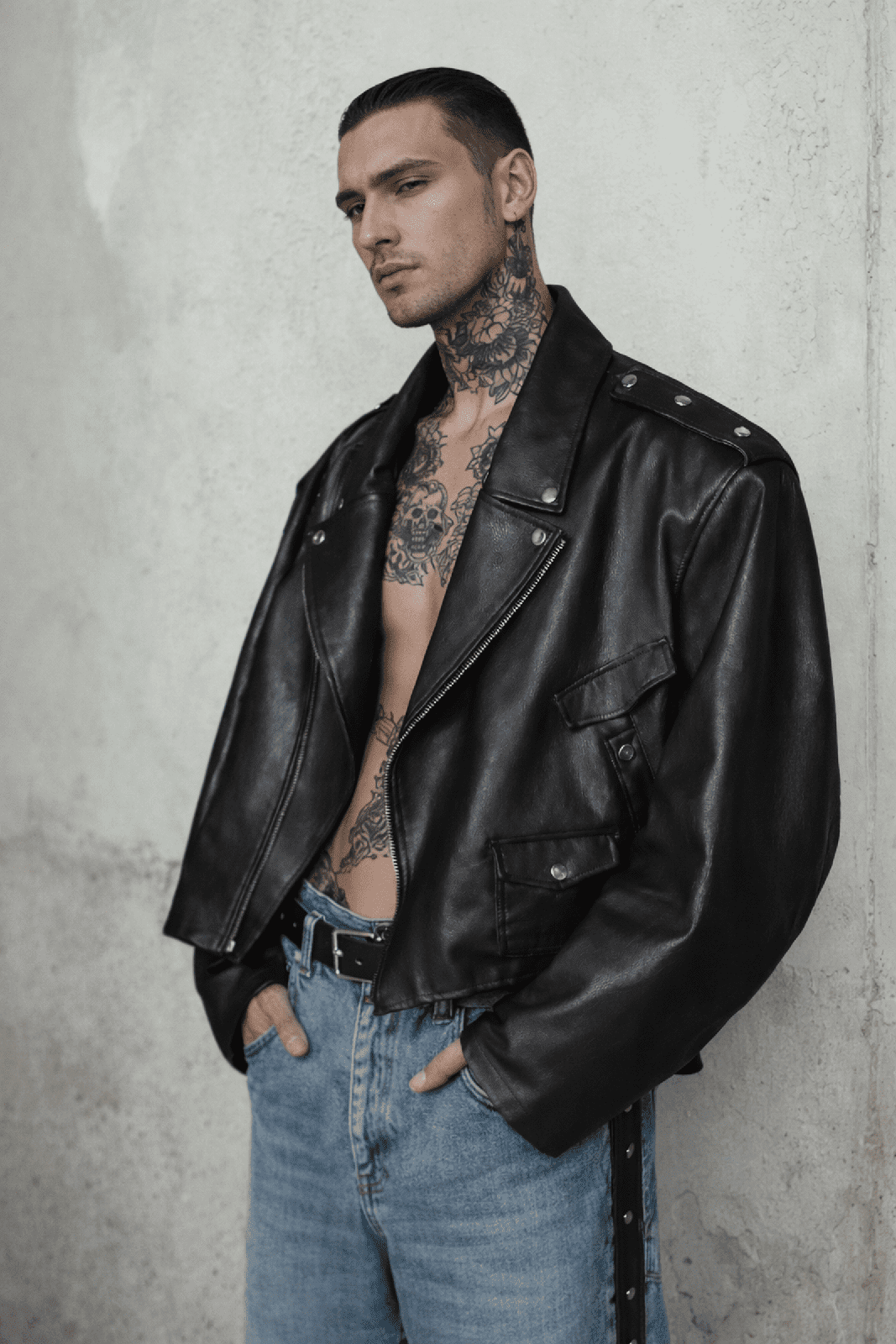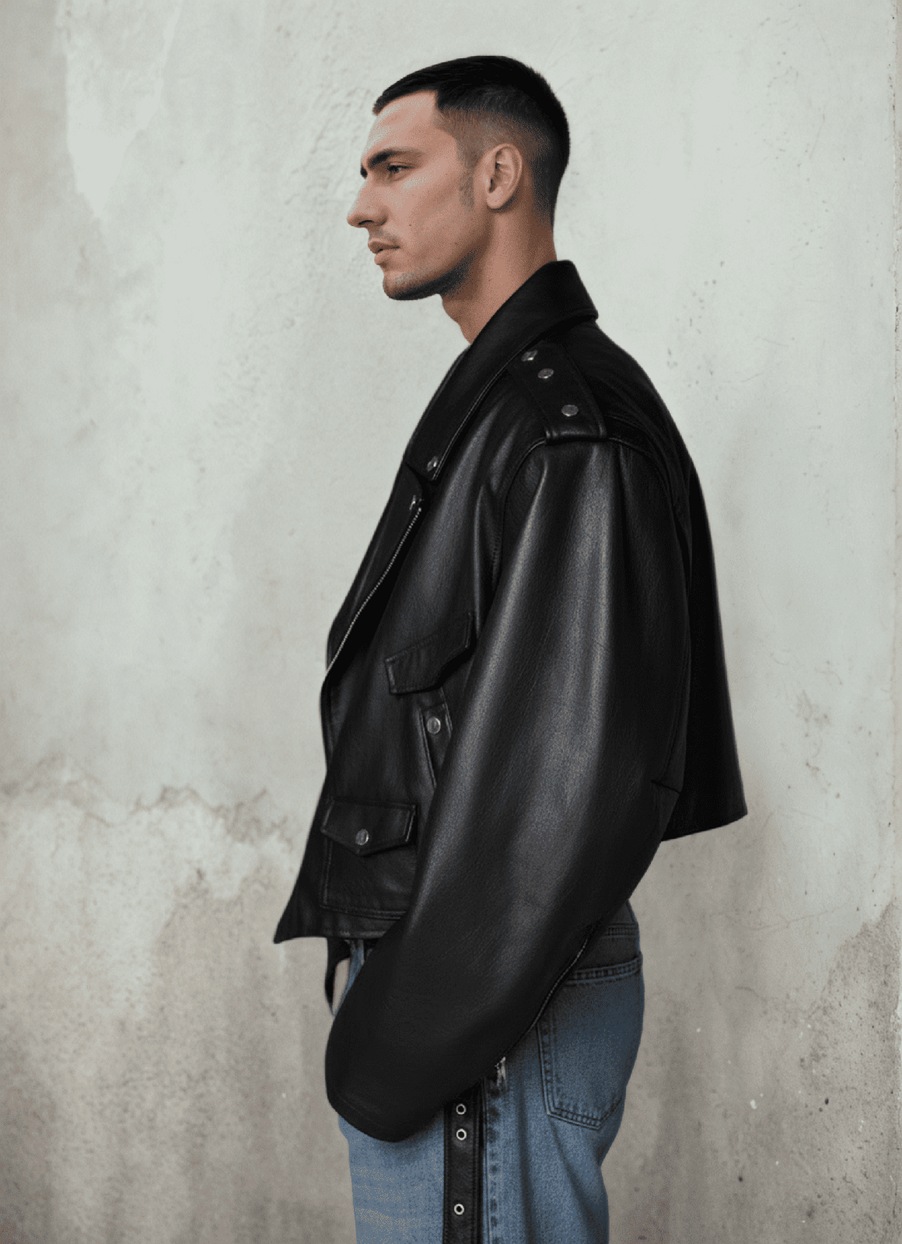 A cropped, oversized biker jacket crafted from smooth PU leather. Heavy look, clean structure, metal rivet details, and a relaxed street fit made for layering in spring and fall.