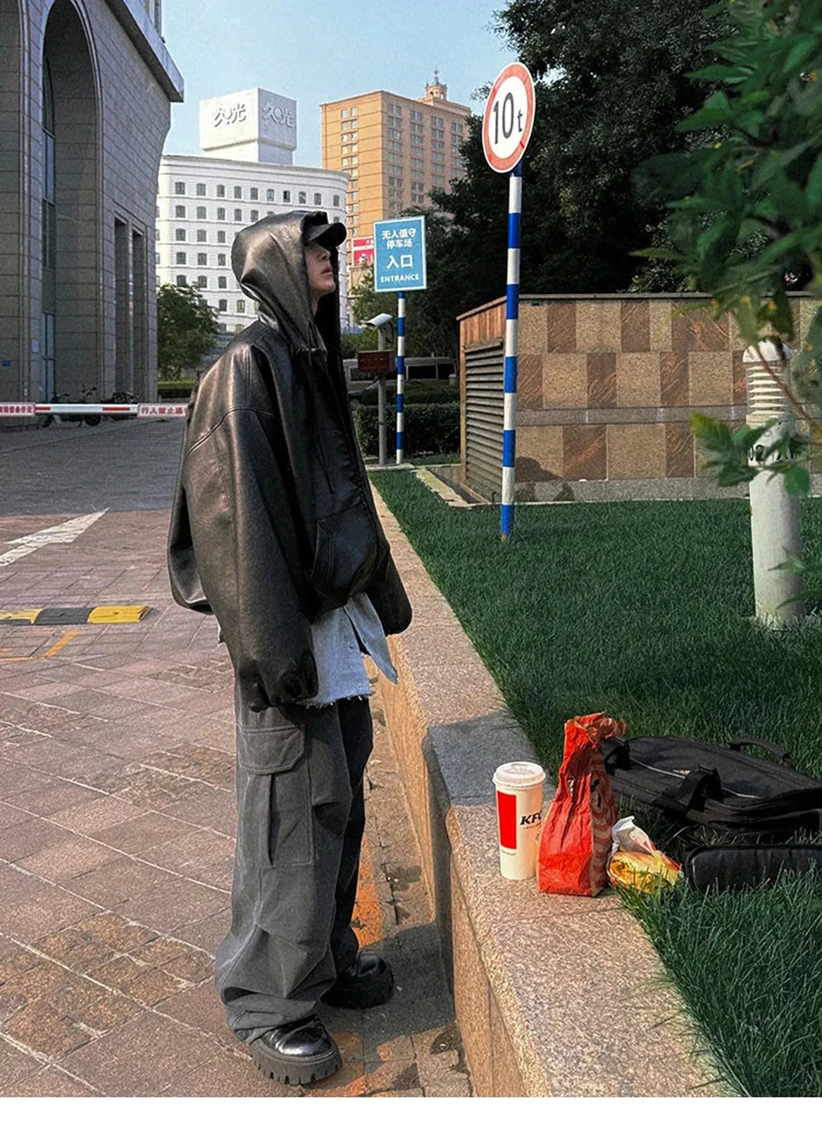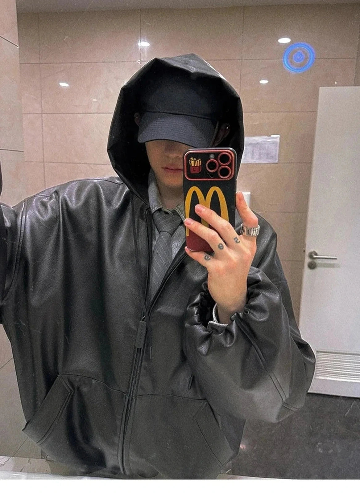 This short black PU leather jacket brings early-2000s attitude with a modern streetwear cut. Designed with a relaxed oversized fit, dropped shoulders, and a built-in hood for that off-duty, after-dark look. Soft faux leather keeps it comfortable while delivering a clean, high-impact silhouette.